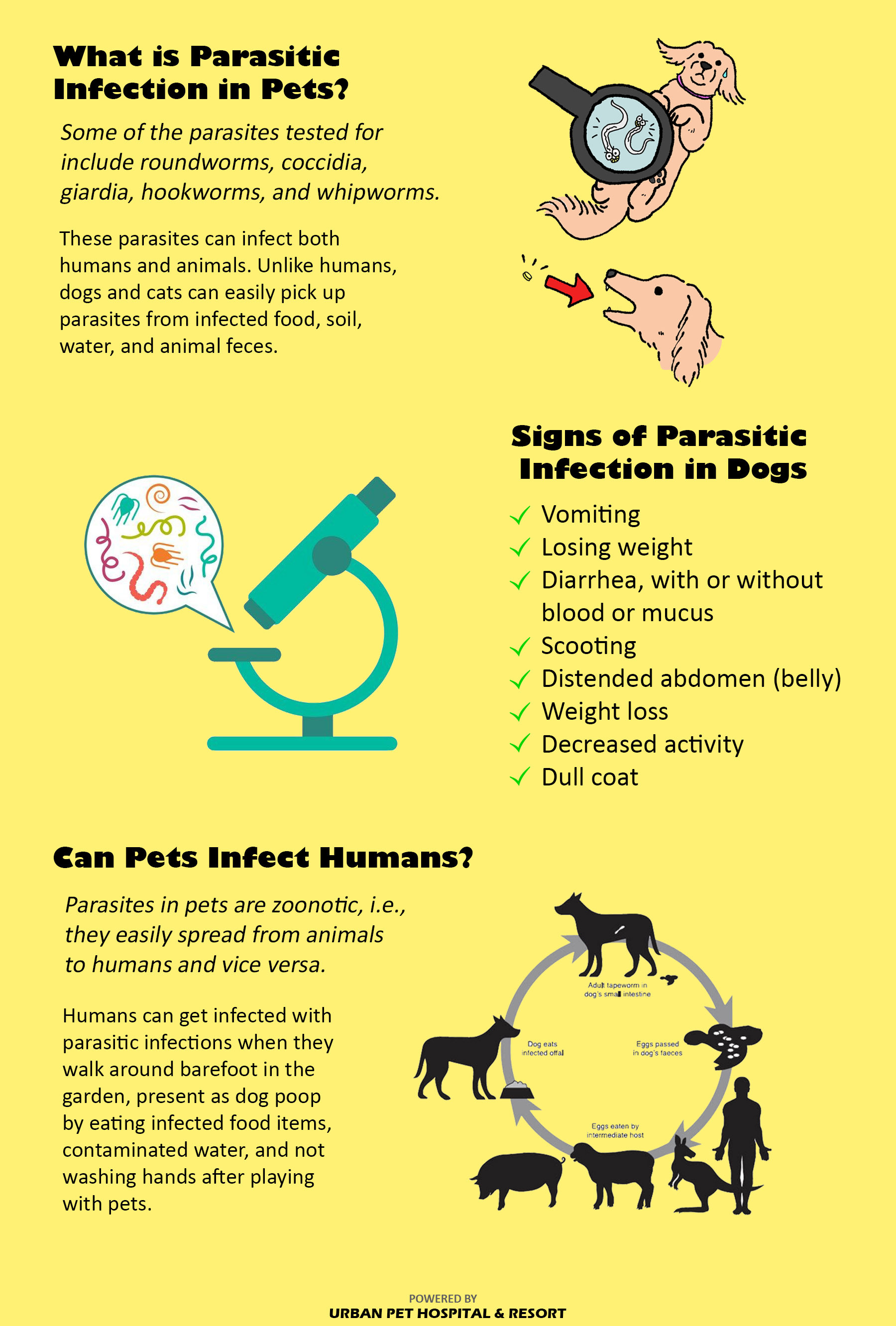 Some of the parasites tested for include roundworms, coccidia, giardia, hookworms, and whipworms. These parasites can infect both humans and animals. Unlike humans, dogs and cats can easily pick up parasites from infected food, soil, water, and animal feces.