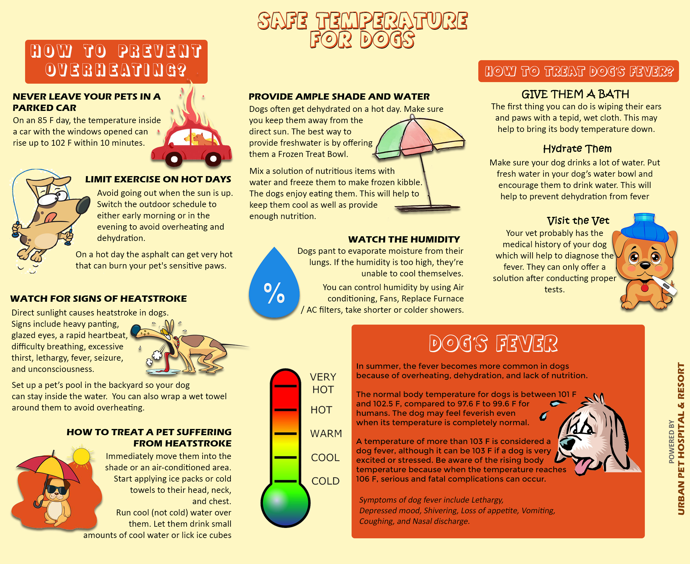 Fever is common in dogs throughout the year. However, in summer the fever becomes more common because of overheating, dehydration, and lack of nutrition. The normal body temperature for dogs is between 101 and 102.5 F, compared to 97.6 to 99.6 F for humans. This implies that dogs may feel feverish even when its temperature is completely normal. A temperature of more than 103 F is considered a dog fever, although it can be 103 if a dog is very excited or stressed.